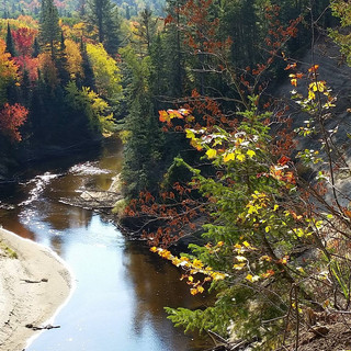 「Arrowhead 箭頭湖省立公園」距離 Huntsville 小鎮不過十來分鐘路程,公園內群山環繞著狀如箭頭的「Arrowhead 箭頭湖」及「Mayflower 五月花湖」,還有一條九轉十八彎的「Big East River 大東河」。這個僅12平方公里的小公園自然無法與7600平方公里、聞名遐邇的「Algonquin 阿公睏公園」相提並論,但它是「阿公」頭上「皇冠」左側的一小粒「珍珠」,我們深愛其清新可喜及可親,更重要的是,遊客稀少,讓它能保有自然本色,少了「車馬喧」引起的「塵囂感」,中國字的「俗」不就指明了,山「谷」多了「人」就「俗」,當尼加拉瀑布和阿公睏公園的人潮及大巴滿眼時,就少了份「閒情」更沒有了「逸致」! 一進公園就被「楓林大道」震攝,Mayflower 湖在高大楓林間若隱若現,讓人忍不住停下車來且走且照,聲聲驚嘆。「慢行」一公里半後到達公園管理處,「秀」了我們的公園季票,拿了路線圖,一開出森林即豁然開朗,只見兩座橋並排眼前,一是車行的水泥橋,一是人行的彎橋,而橋畔兩側一邊是彩色山丘和箭頭湖,一邊是幽深峽谷溪流,晨曦映照下真是美不勝收。 依公園管理處建議,我們「捨長取短」,選擇單程 2.4 公里的瀑布路線,一路行來只有我們這對「牽手」,連松鼠或飛鳥都沒看到一隻,只好與樹幹上或石縫間的「野菇」對話,倒也樂趣無窮,似乎經過一場大自然的心靈洗禮。 「Big Bend 曲流」是公園的地標,走上觀景台,一圓形碗狀的河中沙洲呈現眼前,看了解說,上網查了地理百科,方知「Oxbow Lake 牛軛湖」的成因,走了一趟,也長了見識,真有「活到老,學到老」的快慰: 「Oxbow Lake 牛軛湖」是一種形態奇妙的湖,屬於河川中下游地形。河川由上游往中下游流時,愈到下游河道愈寬,流速愈緩,就容易形成彎曲而流的現象,稱為「曲流」。曲流外側水流較急,河岸在河水不斷沖擊下會逐漸崩解後退,形成較陡凹岸,稱之為「切割坡」。而曲流內側水流較緩,會產生泥沙淤積,成為向外凸出的凸岸,也稱做「堆積坡」。侵蝕久後,河道彎曲程度會愈來愈大;最後「曲流頸」會被切穿,河川將會改變流道,形成另一條筆直的新河道;而舊有的曲流頸淤塞將形成一「半月形湖」,一如耕牛頸上架上的「牛軛」般,就稱為「牛軛湖」。詳見照片圖示。