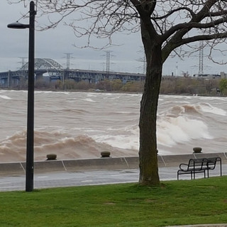 沒想到一下車即被眼前湖景震攝,一向碧波蕩漾的安大略湖今日是如此猙獰凶猛,狂風掀起濁浪波波湧至岸邊,公園管理處的工作人員正忙著以黃色長膠帶在樹間圈起,禁止遊人入內。他說多年來這是第一次看到大湖水位如此高漲狂暴,盡淹各個沿湖公園的步道及娛樂設施。 安大略湖畔有很多依水迷人的小鎮,人口僅17萬的 Burlington 和鄰近的 Oakville 近幾年以生活品質及教育水準名列加拿大最適宜居住的前幾名。 Burlington 有最佳的騎行步道 Water Front Trail,沿著 Lakeshore 湖濱大道都是掩映參天古樹間的各式豪宅巨邸,間有公園綠地讓平民如我等,仍可一親大湖芳澤。