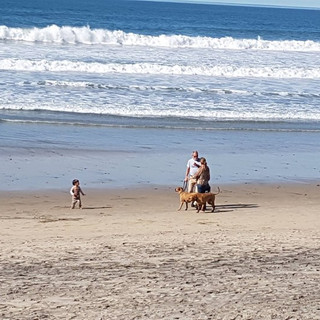 「Nobody knows」時,包括醫生都哄然大笑起來,謝謝思允提供的笑料。 午飯前短短一小時的空檔,我們「直奔」浩瀚的太平洋,「葛診」距離海邊僅兩條街,沿著海堤有木棧道直達美墨海岸高牆,由於是週末,海邊弄浪玩潮的遊人及狗狗不少,來回一個小時走下來,久未操練的我,